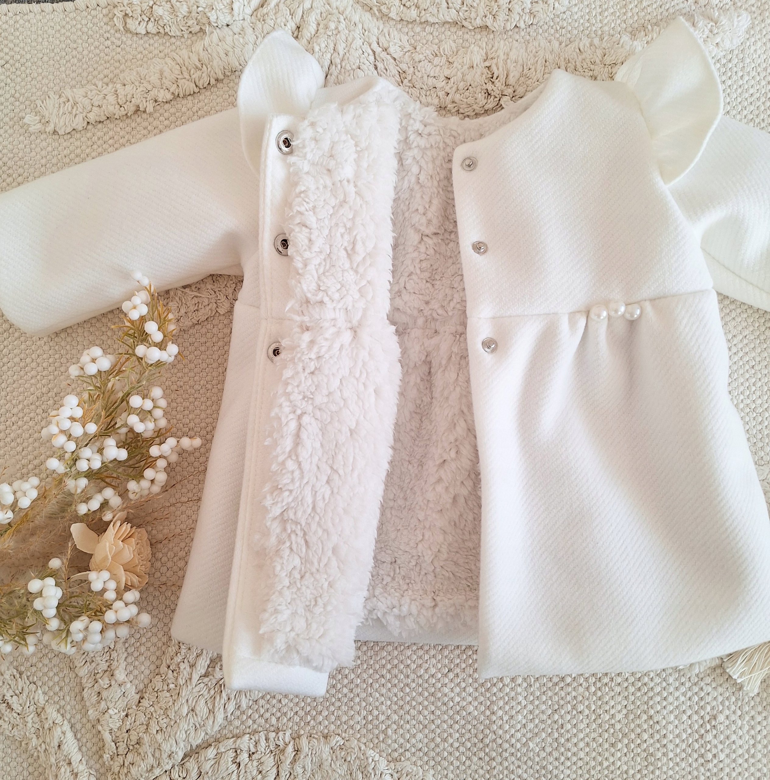 Предмет продажу - зимове пальто, колір екрю/кремовий, з м'якою, пухнастою підкладкою з овчини, яка обшиває перед і спинку пальто. Рукава мають стьобаний утеплювач з утеплювачем для зручності одягання.