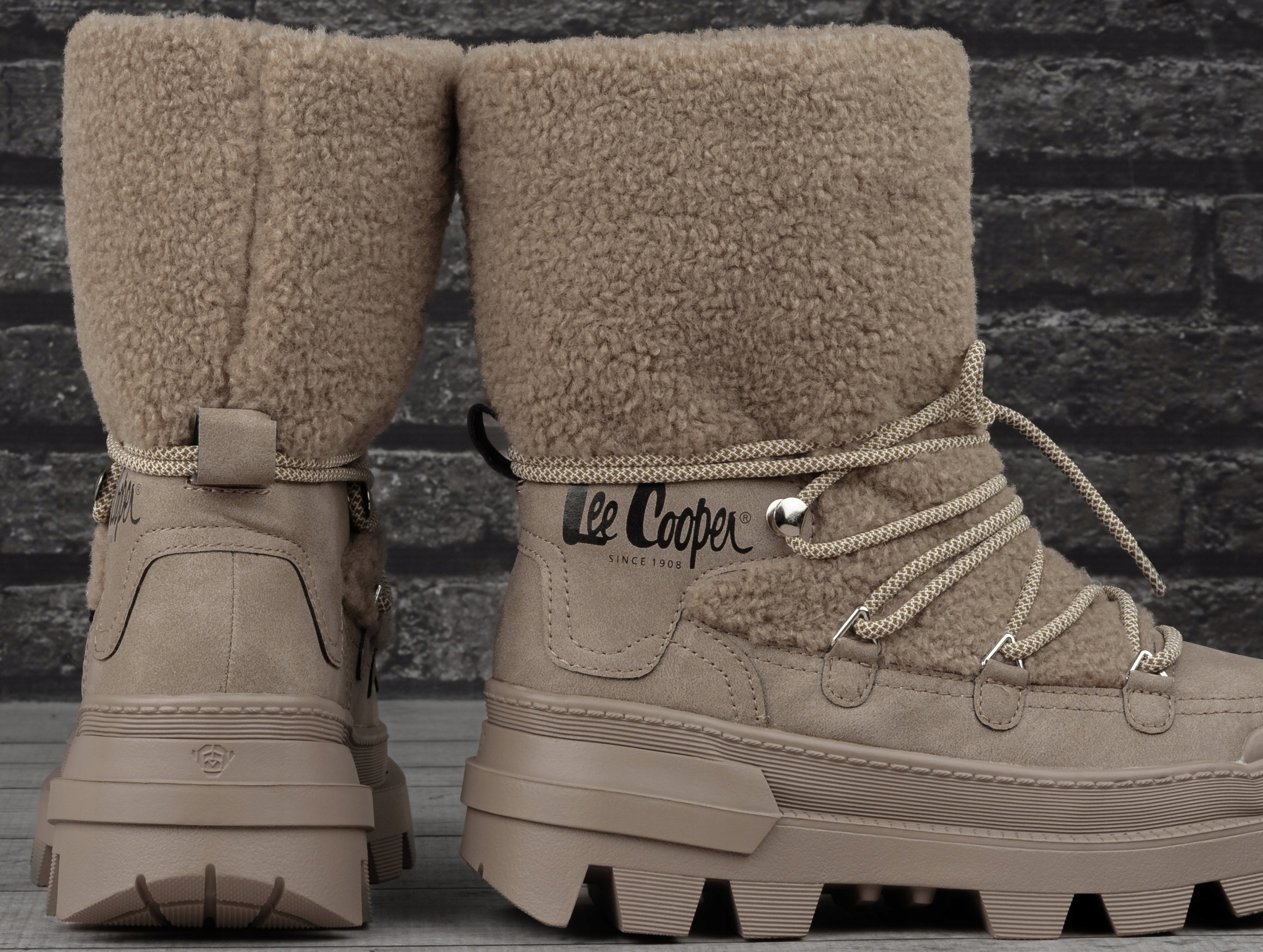 Жіночі снігові черевики відомого бренду Лі Купер були виготовлені з синтетичного матеріалу та текстильного матеріалу. Інтер'єр густо ізольований хутро , що забезпечує захист від морозу та м'якості ходьби. Модель була встановлена на модній, товстій підошві. Завдяки канавам, ця підошва - non -slip , і завдяки товщині ізоляції та добре поглинають з землі. Снігові чоботи Lee Cooper зашнуровані , завдяки якому верхній може бути адаптований до ширини стопи, і це запобігає потраплянню холодного повітря. Комфортне, утеплене спортивне взуття Lee Cooper - це чудово в осінній та зимовий сезон.