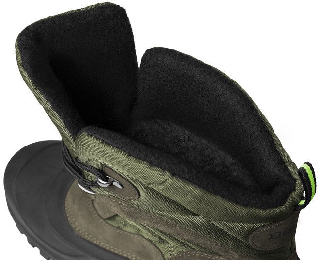 Взуття DELPHIN GATOR призначене для екстремальних експедицій, особливо в холодну пору року. Піднятий гумовий край підошви доходить до щиколотки, тому ходити по болотах, талому снігу та грязі для GATOR не проблема. Цю гумову частину також дуже легко чистити. Верх у цьому стилі – це поєднання міцної нейлонової тканини та штучної шкіри. Ці матеріали стійкі до негоди і при необхідності їх легко просочити. Язичок черевика вшитий на висоту 17 см, що дозволяє недовго пересуватися в таких глибоких сирих місцях. Шнурівка - це рішення через текстильні люверси, у верхній частині шнурівки є одне металеве вушко. Внутрішня частина взуття виконана зі зручного мікрофлісу. Тепловий комфорт забезпечує шар штучної мікрофібри між зовнішнім і внутрішнім шарами. Чорно-зелене поєднання матеріалів оцінять не тільки рибалки, а й мисливці, туристи та всі інші любителі природи. Незважаючи на свою міцність, взуття дуже легке, що неодмінно стане в нагоді під час тривалих прогулянок. Наприклад, обидва туфлі 43 розміру важать лише 1200 г.
