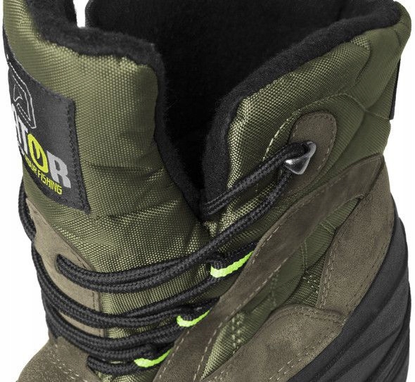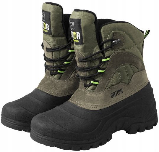 Взуття Delphin GATOR призначене для екстремальних експедицій, особливо в холодну пору року. Піднятий гумовий край підошви доходить до щиколотки, тому ходити по болотах, талому снігу та грязі для GATOR не проблема. Цю гумову частину також дуже легко чистити. Верх у цьому стилі – це поєднання міцної нейлонової тканини та штучної шкіри. Ці матеріали стійкі до негоди і при необхідності їх легко просочити. Язичок черевика вшитий на висоту 17 см, що дозволяє недовго пересуватися в таких глибоких сирих місцях. Шнурівка - це рішення через текстильні люверси, у верхній частині шнурівки є одне металеве вушко. Внутрішня частина взуття виконана зі зручного мікрофлісу. Тепловий комфорт забезпечує шар штучної мікрофібри між зовнішнім і внутрішнім шарами. Чорно-зелене поєднання матеріалів оцінять не тільки рибалки, а й мисливці, туристи та всі інші любителі природи. Незважаючи на свою міцність, взуття дуже легке, що неодмінно стане в нагоді під час тривалих прогулянок. Наприклад, обидва туфлі 44 розміру важать лише 1200 г.