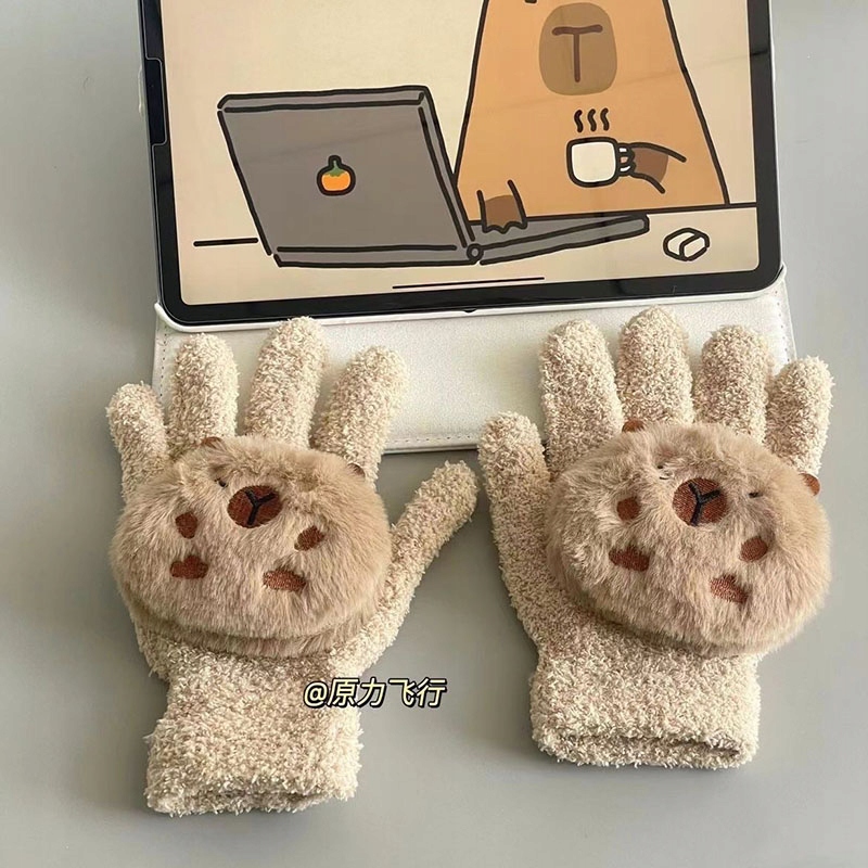 Виготовлені з м'якого і теплого хутра, який чудово захищає від морозу і вітру. Амбушури та рукавички мають форму голови капібари.