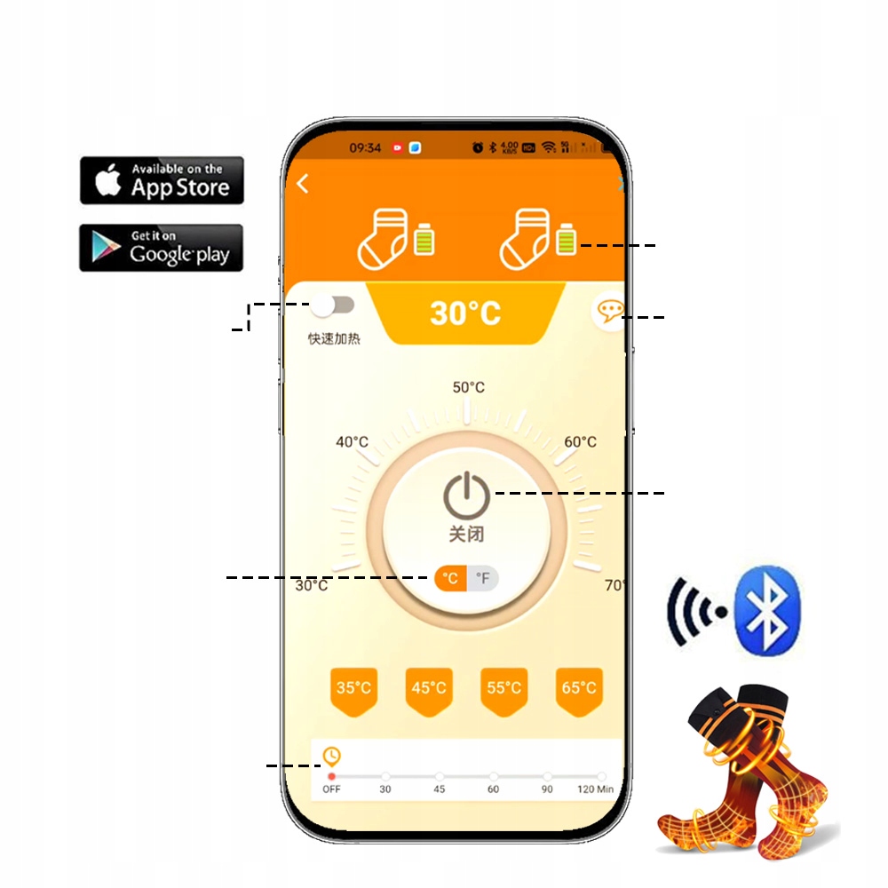 Застосування, з багатьма налаштуваннями температури, ви також можете встановити таймер комутації. Натисніть і утримуйте перемикач акумулятора протягом 3 секунд, щоб контролювати температуру.