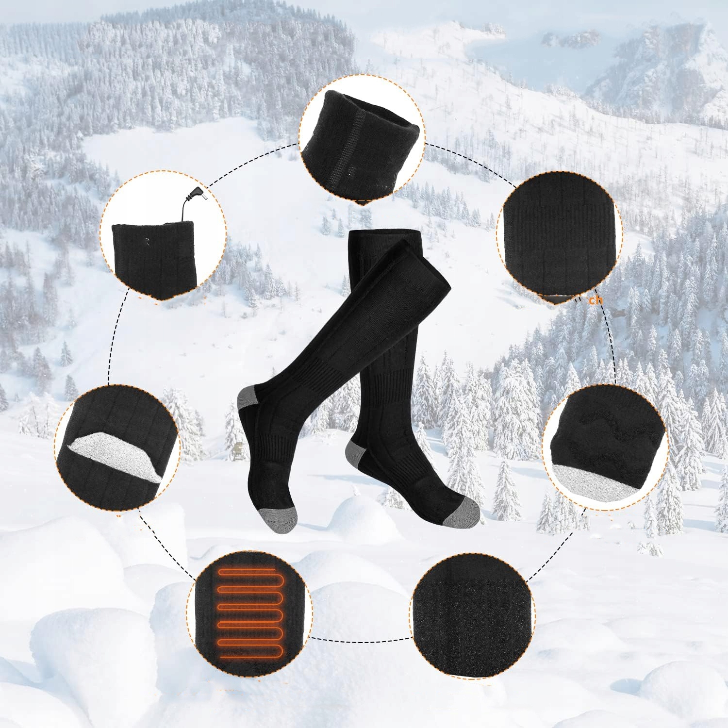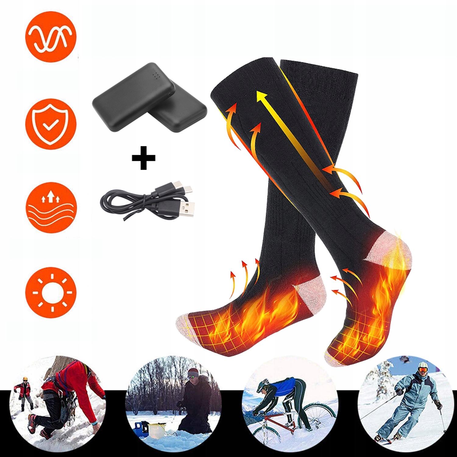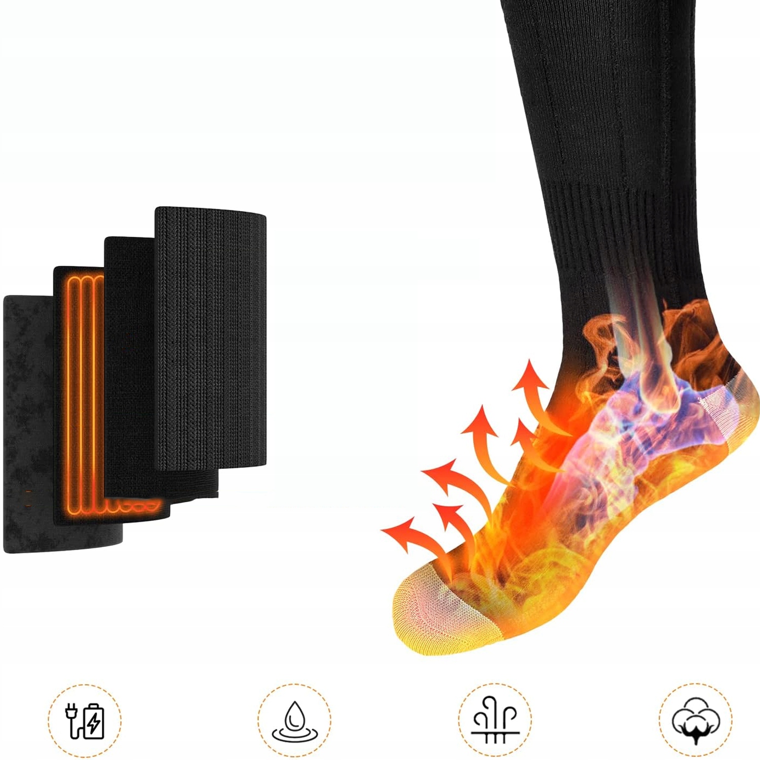 - - Шкарпетки з підігрівом виготовлені з безпечного матеріалу. Дихаюча, швидковисихаюча, спеціально розроблена, вогнестійка бавовна забезпечує відчуття безпеки під час використання. Що ще важливіше, інфрачервоні нагрівальні елементи шкарпеток з підігрівом можуть стимулювати кровообіг. - Можна прати, ручне та машинне прання, перед пранням вийняти батарею, покласти шкарпетки в мішок для білизни (щоб зарядний кабель не зламався).