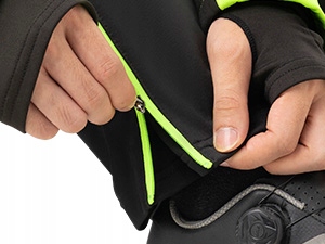 Велосипедні шорти виготовлені з 94% поліестеру + 6% еластану, інтер’єр виготовлений з м'якого та теплого флісу, а також поза вітряностійким та водонепроникним матеріалом. Штани є водонепроникними, , але вони не підходять для використання під час сильного дощу. Кишені на велосипедних шортах забезпечують багато місця для дрібних предметів, таких як навушники та клавіші. Замок на нозі штанів; елементи.