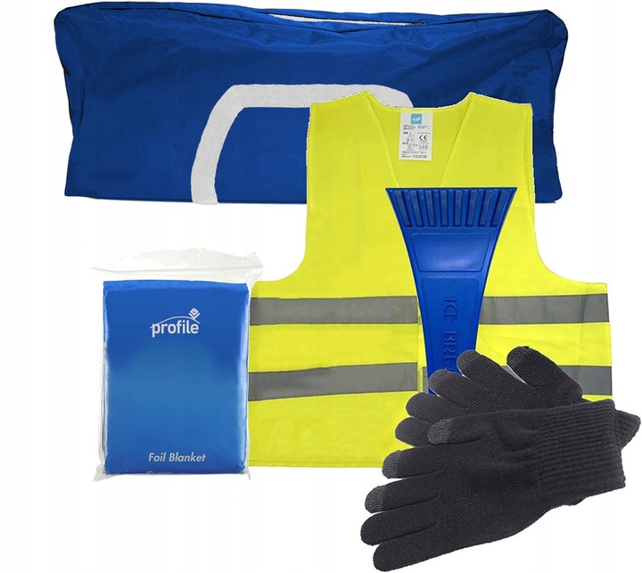 Зимовий автомобільний комплект від бренду SafeTravel. Сумка містить жилет, рукавички, скребок і фольгу, яка ідеально підходить для зимового сезону.