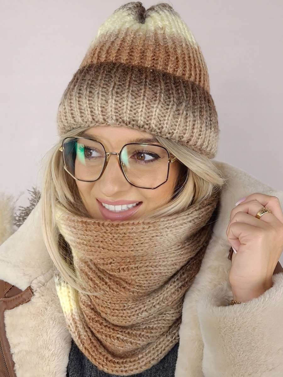Універсал Виріз на обличчя з красивим плетінням і розтушованими кольорами підійде до будь-якої осінньої або морозної зимової укладки. Шапка-закатка прикрашена металевим логотипом бренду, великий шарф одягнений один раз, все красиво сидить. Дуже м'які та зручні у використанні!