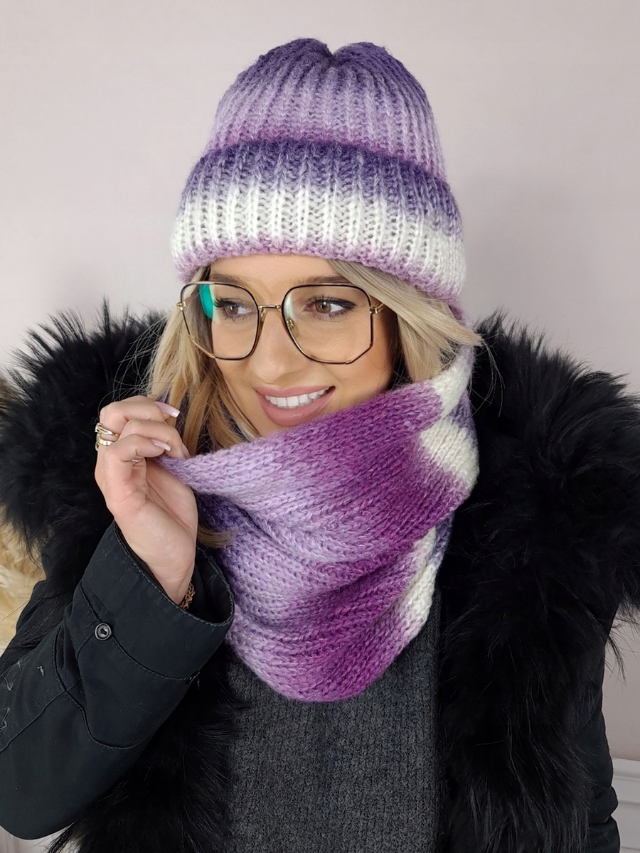 Універсальний лицьовий виріз з красивим плетінням і розтушованими кольорами ідеально підійде до будь-якої осінньої або морозної зимової укладки. Шапка-закатка прикрашена металевим логотипом бренду, великий шарф одягнений один раз, все красиво сидить. Дуже м’які та зручні у використанні!