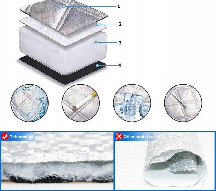 Сун -козирок до переднього скла виготовляється з постійного і стійкого до пошкодження поліестеру , що забезпечує його тривалову міцність та захист від шкідливих зовнішніх факторів . Килимок обладнаний двома шарами поліестеру, які мають окремі завдання: