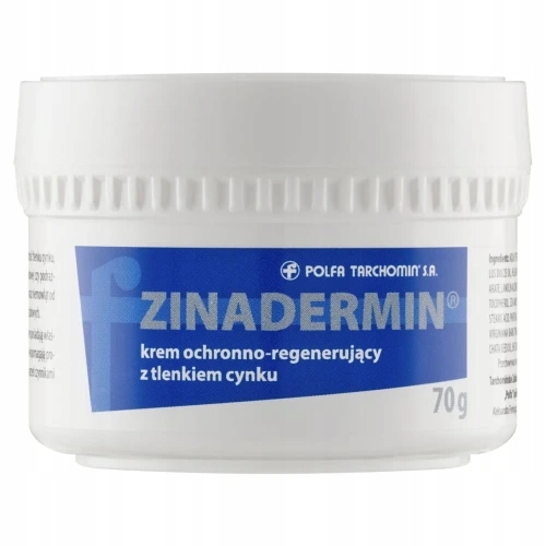 Крем Зінадермін - це косметичний засіб у формі крему для догляду та захисту шкіри. Препарат особливо рекомендований для вугрової висипки, себорейної або подразненої шкіри, а також для догляду та захисту роздратованої шкіри, включаючи область підгузків. Крем Зінадермін містить оксид цинку і екстракт гамамелісу, які мають в'яжучі і захисні властивості. Мигдальне масло, вітаміни. E, F і бджолиний віск підтримують процеси регенерації епідермісу, створюють оклюзійний шар на шкірі, захищаючи її від зовнішніх факторів. Препарат призначений для немовлят з першого дня життя, дітей та дорослих.