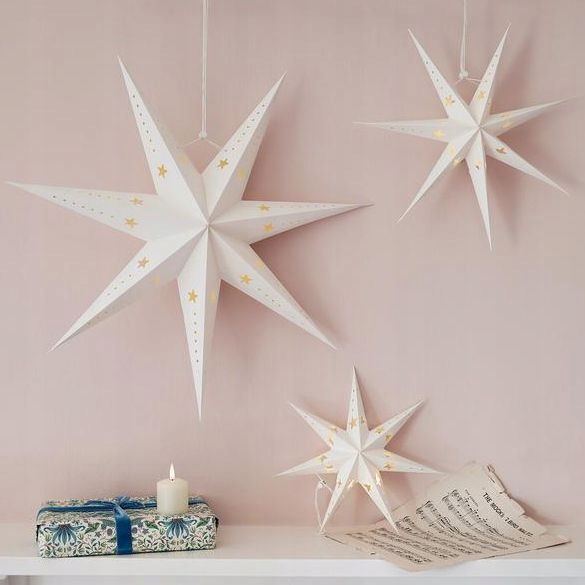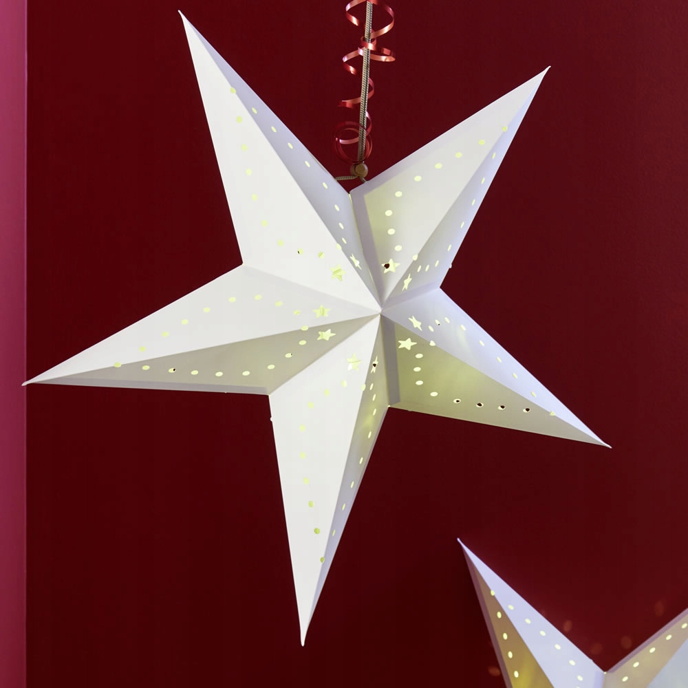 Ялинкові прикраси — це не лише ялинка, прикрашена кульками та вогниками. Однією з таких унікальних новорічних прикрас є ця красива паперова зірка. Виготовлена з цупкого картону, тому легко зберігає форму. Ми можемо повісити його на люстру або стелю. Чудово виглядає підвішеним у вікні на карнизі - його видно як всередині квартири, так і зовні. На поверхні ажурний візерунок з дрібними зірочками. Для підвішування використовується біла нитка.