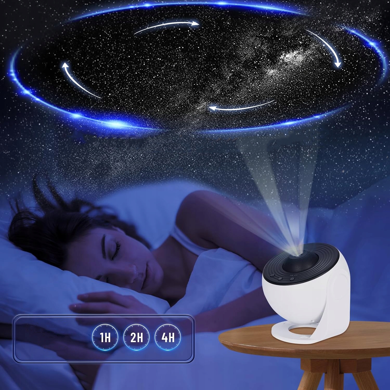 галактичне світло зіркового проектора в спальні можна встановити так, що він автоматично вимикається через 1 або 2 години. Крім того, він автоматично вимикається через 4 години (за замовчуванням), коли ви засинаєте, якщо ви забудете встановити таймер.