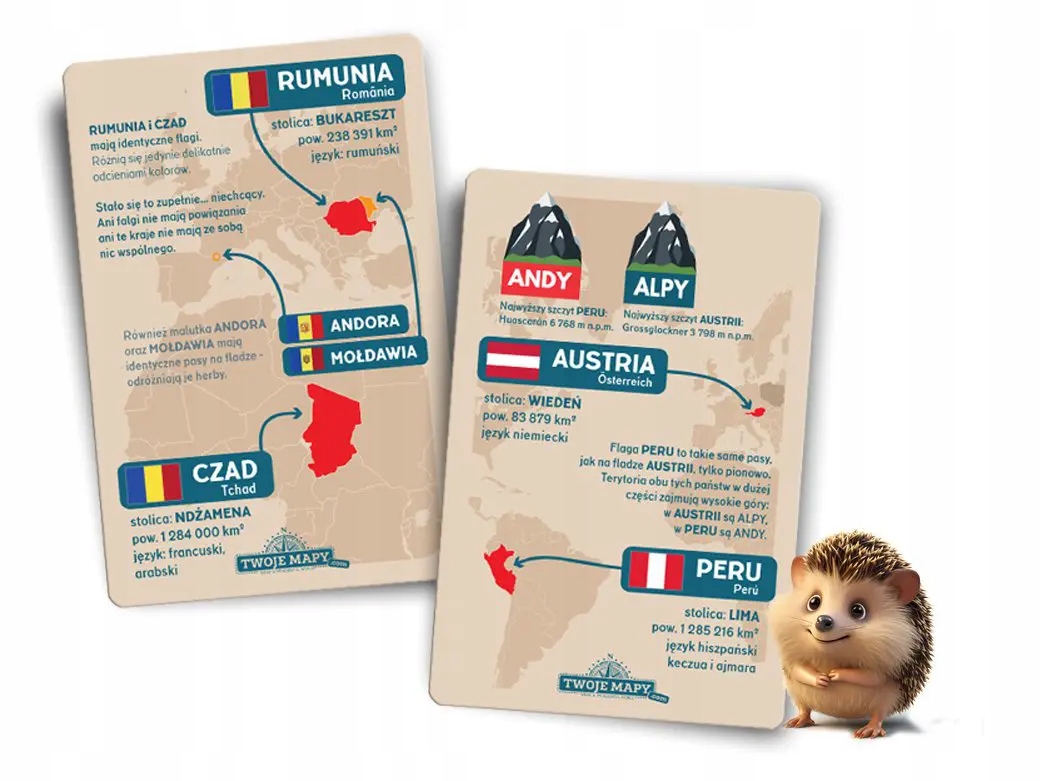 - зворотна сторона містить оглядові карти, на яких зображені згадані країни, їхні столиці та їхні сусіди;