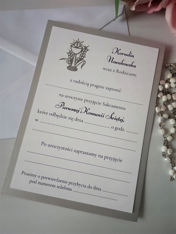 Елегантне, делікатне запрошення на Перше Святе Причастя зі срібною чашею для самостійного написання.