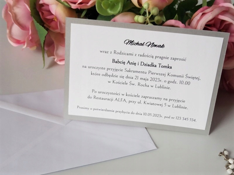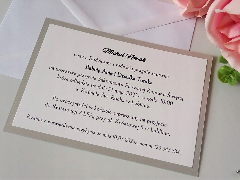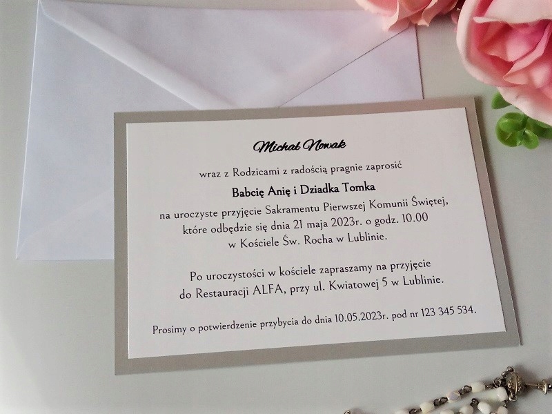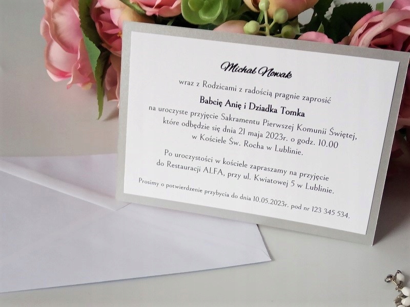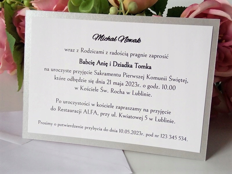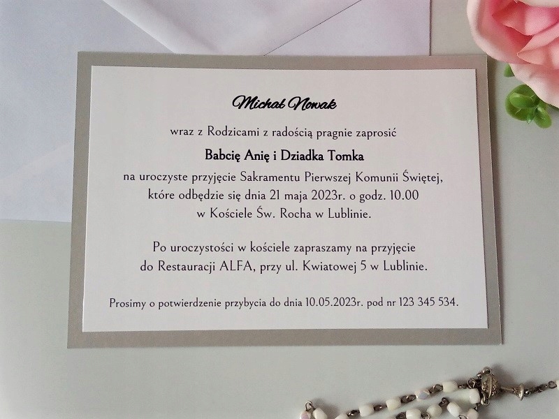 - реквізити запрошених гостей - в іншій формі - ЯК БУДЕ. ДРУКУВАННЯ НА ЗАПРОШЕННЯХ (наприклад, Sz. P. Monika та Krzysztof Kowalski, тьотя Кася та дядько Міхал Вишневський з дітьми, бабуся Basia та дідусь Роман),