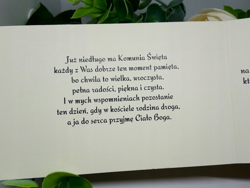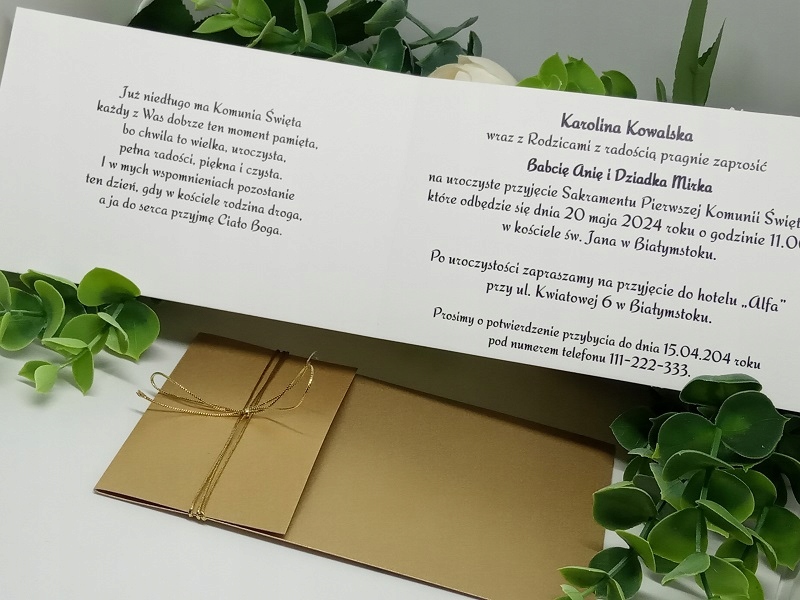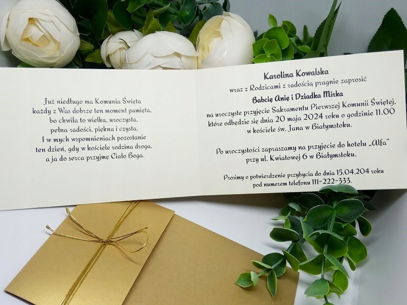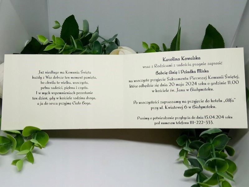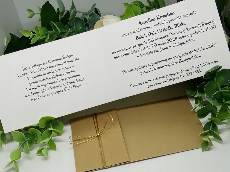 Елегантний, делікатний запрошення до першого Святого Причастя. Папір (білизна) 246 г/м2. . Введіть деталі людини, яка запрошує, дані гостей, дату та місце прийняття таїнства, місце прийняття причастя та дату та номер телефону для підтвердження прибуття.