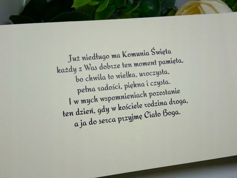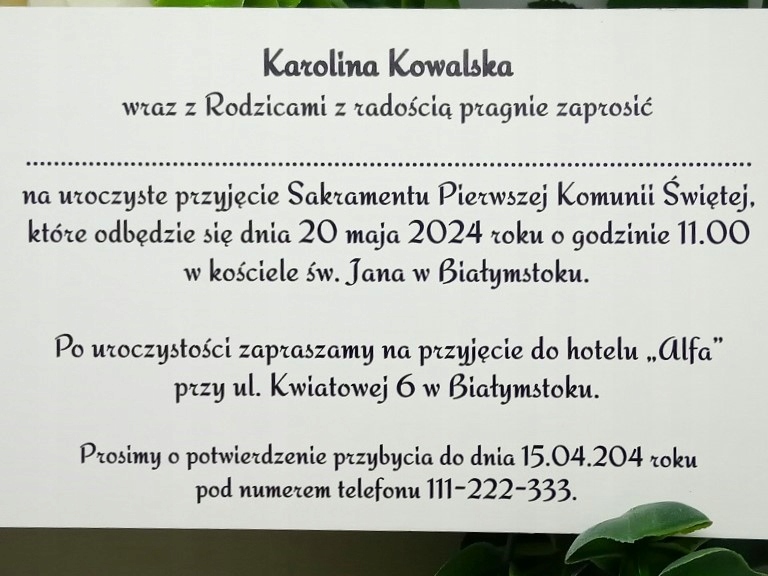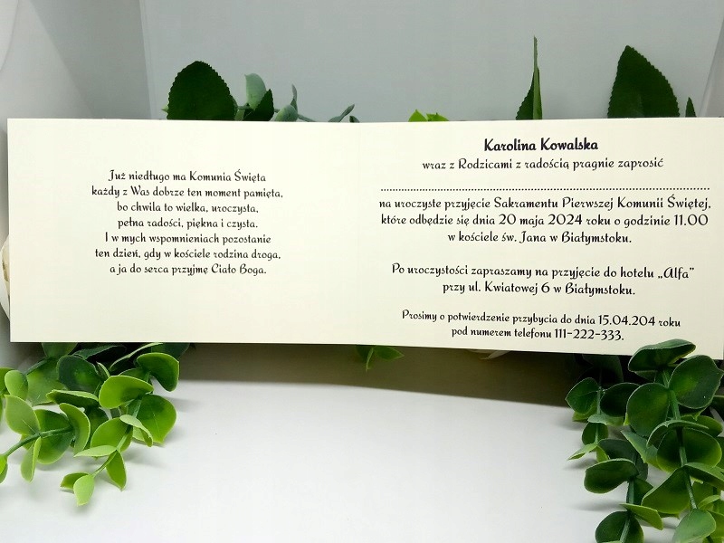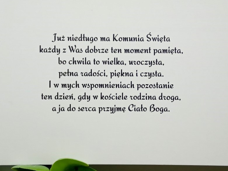 - Текст запрошення надрукований всередині. Вписуємо дані особи, яка нас запрошує, дату і місце прийняття Святої Тайни, місце прийняття Першого Причастя та дату і номер телефону для підтвердження прибуття. МИ НЕ ВВОДИМО ІНФОРМАЦІЮ ЗАПРОШЕНИХ ГОСТЕЙ. ЗАЛИШТЕ ЇМ КРАПКИ.