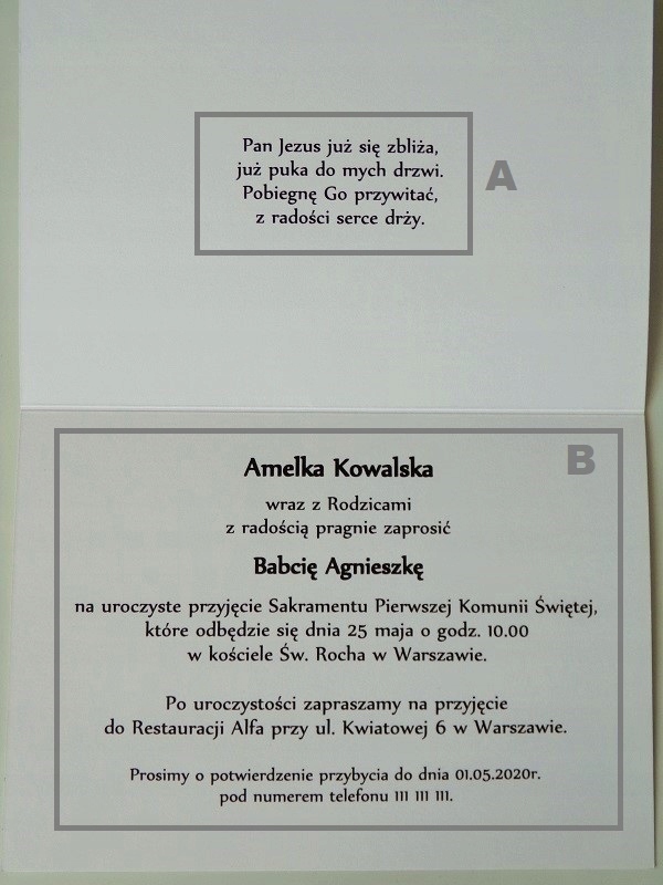 * вміст, який повинен бути введений у частині С у запрошеннях та типі шрифту (наприклад, запрошення до першого святого причастя Амельки, шрифт 21),