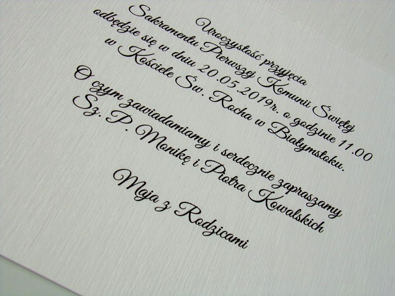 Надана ціна включає повну персоналізацію, тобто введення даних особи, яка запрошує, дані гостей, дату та місце прийняття таїнства, місце причастя та дата та номер телефону для підтвердження приїзду.