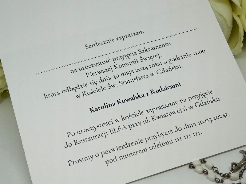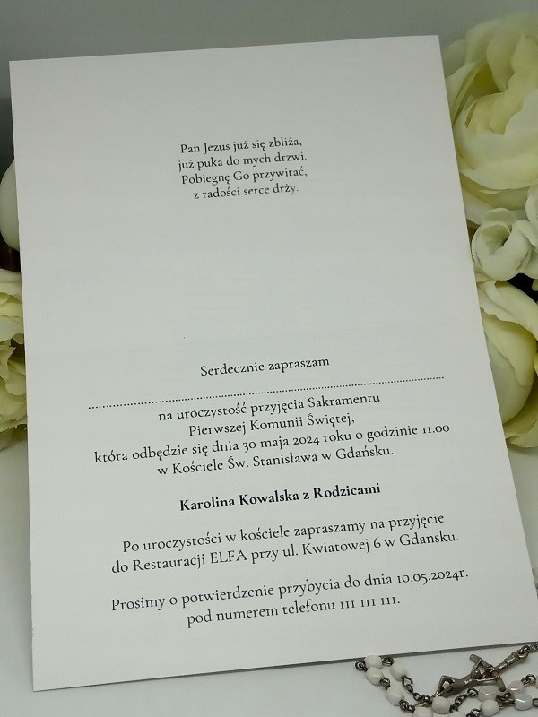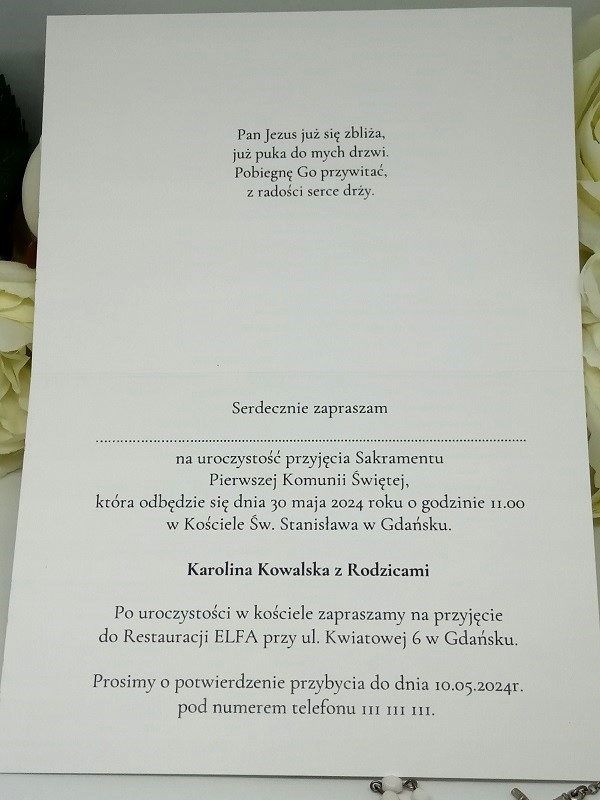 - Дана ціна включає персоналізацію, тобто введення даних особи, яка запрошує, дату та місце прийняття таїнства, місце вступу та дату та номер телефону для підтвердження прибуття. не вводить дані запрошених гостей. Ми залишаємо їх пунктирними.