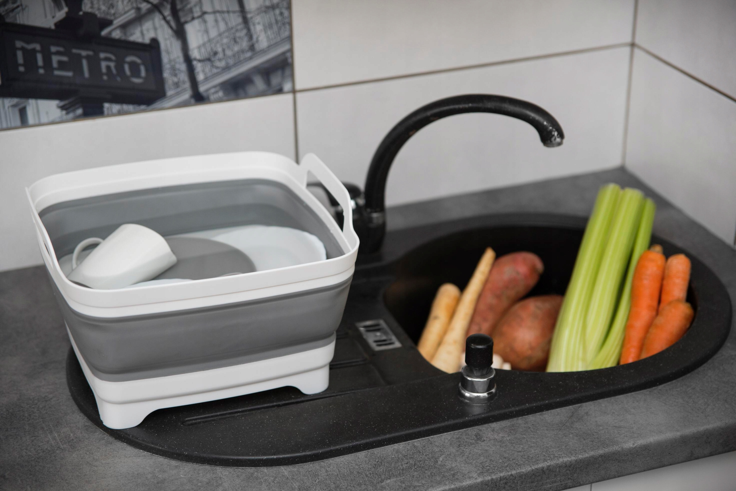 Складна компактна мийка буде практичним доповненням у вашому домі. Після складання він досягає невеликих розмірів, тому ви можете приховати його скрізь і не займає багато місця. Доступно в модних кольорах: Біло-сірий.