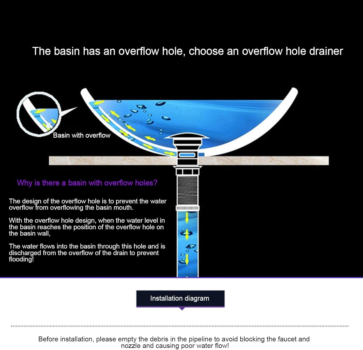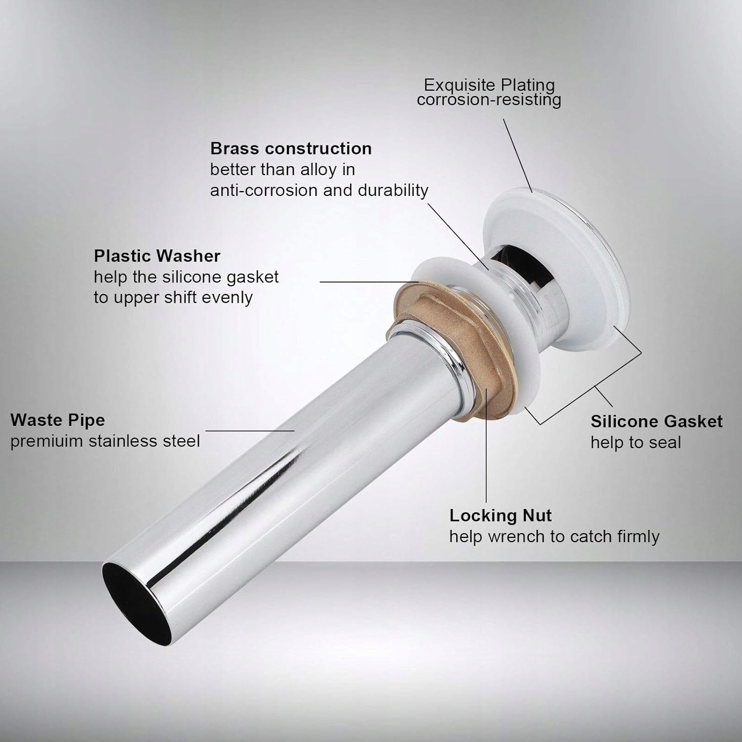 Латунь і нержавіюча сталь Зливна пробка виготовлена з латуні, а вихлопна труба – з нержавіючої сталі. Забезпечте якість і довговічність. Поліроване латунне покриття Злив раковини має поліроване латунне покриття, а високо полірована поверхня яскрава, як дзеркало, без тьмяного або тьмяного покриття, стійка до щоденних подряпин і корозії. Елементи зливу без переливу Висувна зливна пробка має гарну установку зливу без переливу. Цей злив підходить для контейнерів або невстановлених раковин без переливу. Конструкція м’якого силіконового ущільнювача Для запобігання протіканню дренажний пристрій оснащений кріпленням і м’якими силіконовими ущільнювачами. Переконайтеся, що ущільнювач знаходиться в правильному положенні, дивіться фотографії продукту. Легке встановлення Цей зливний отвір для раковини у ванній кімнаті легко встановити, і вам не потрібно витрачати час, дуже зручно.