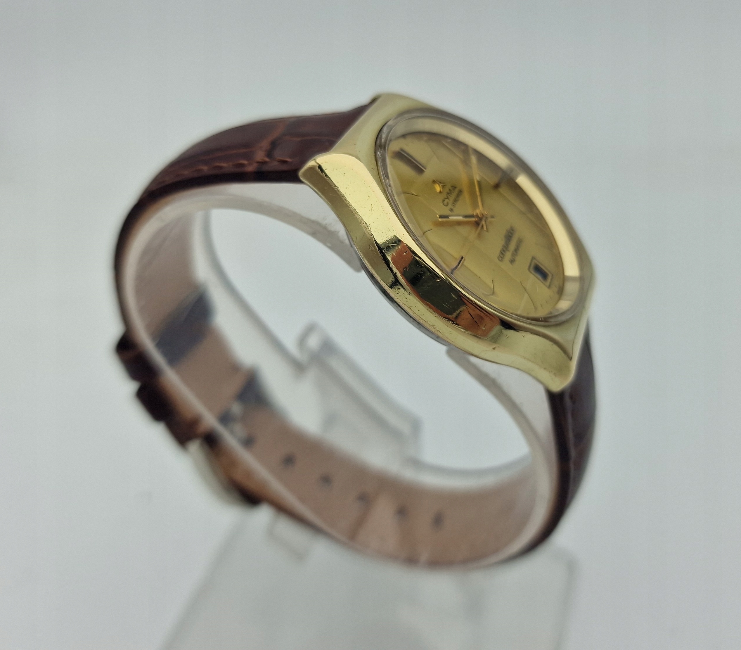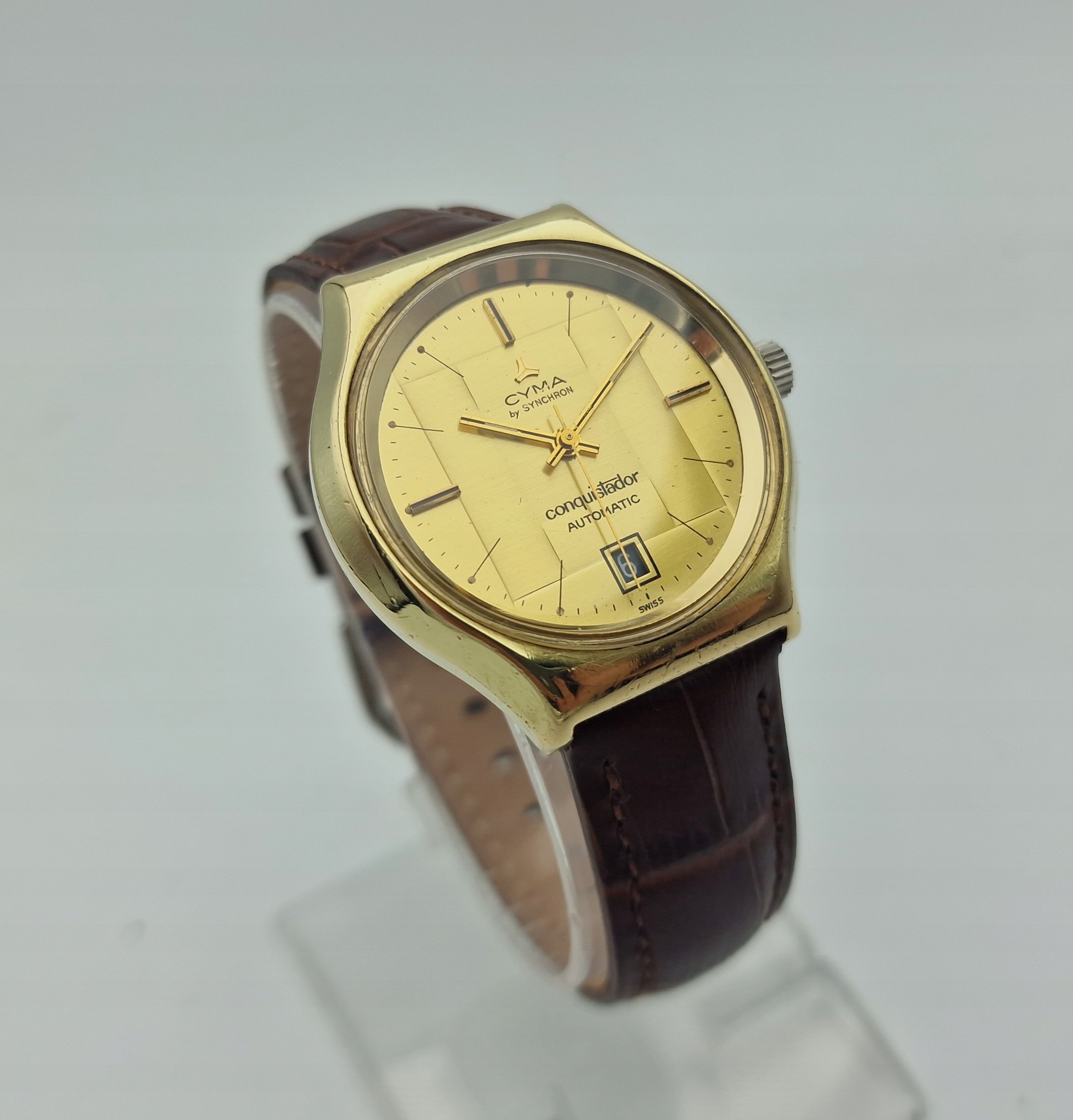- Золотий металевий циферблат із відображенням дати на 6 годині. Оригінальний циферблат із підписом: "CYMA BY SYNCHRON, CONQUISTADOR, AUTOMATIC, SWISS". Циферблат в ідеальному стані, видно на фото.