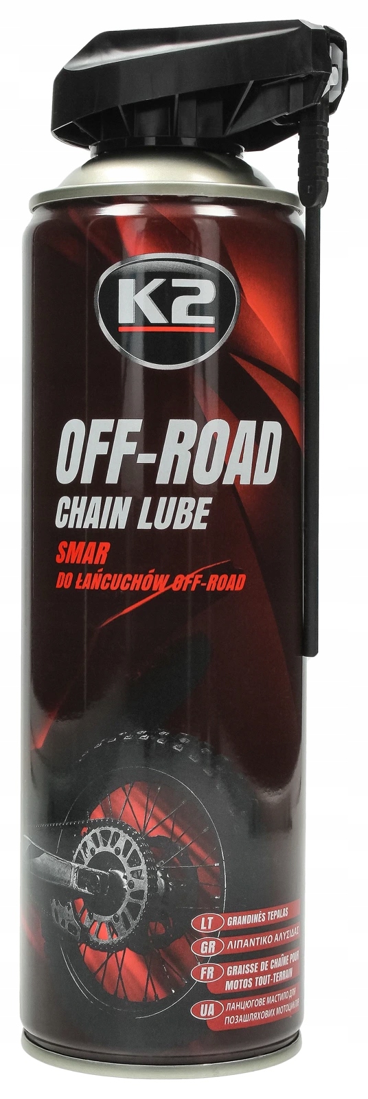 Мастило K2 OFFROAD забезпечує чудове змащення ланцюга та зірочок позашляхових мотоциклів і квадроциклів. Змащувальні та проникаючі властивості продукту захищають ланцюг і зірочки від зносу за будь-яких умов. Підходить для всіх типів ланцюгів (x-ring, o-ring, z-ring тощо).