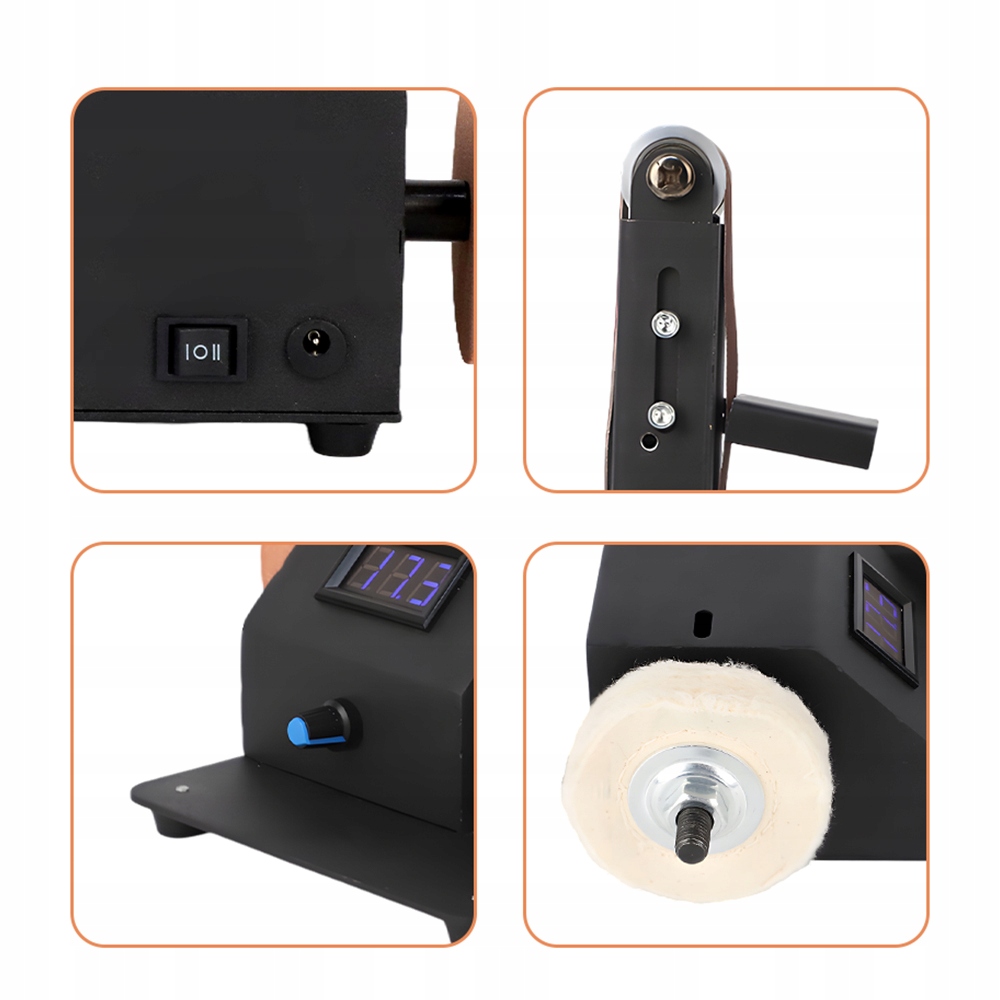 ✨【Плавне регулювання】:Ця стрічкова шліфувальна машина має плавне регулювання швидкості та дисплей швидкості. Плавне регулювання швидкості дозволяє ідеально налаштувати машину на різні матеріали. Кнопка поруч із джерелом живлення також дозволяє змінювати напрямок обертання стрічки, задовольняючи всі ваші потреби шліфування.