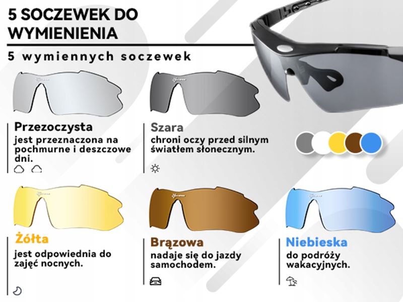 ☀【1 пара сірих лінз + 4 пари оригінальних лінз для заміни】 5 змінних лінз надають більше можливостей для різноманітних заходів на свіжому повітрі. ① Сірі поляризовані лінзи захищають ваші очі від сильного сонячного світла. ② Жовті лінзи підходять для нічних занять. ③ Прозорі лінзи не запотівають і призначені для хмарних і дощових днів. ④ Темно-коричневі лінзи підходять для водіння. ⑤ І синій для святкових подорожей.