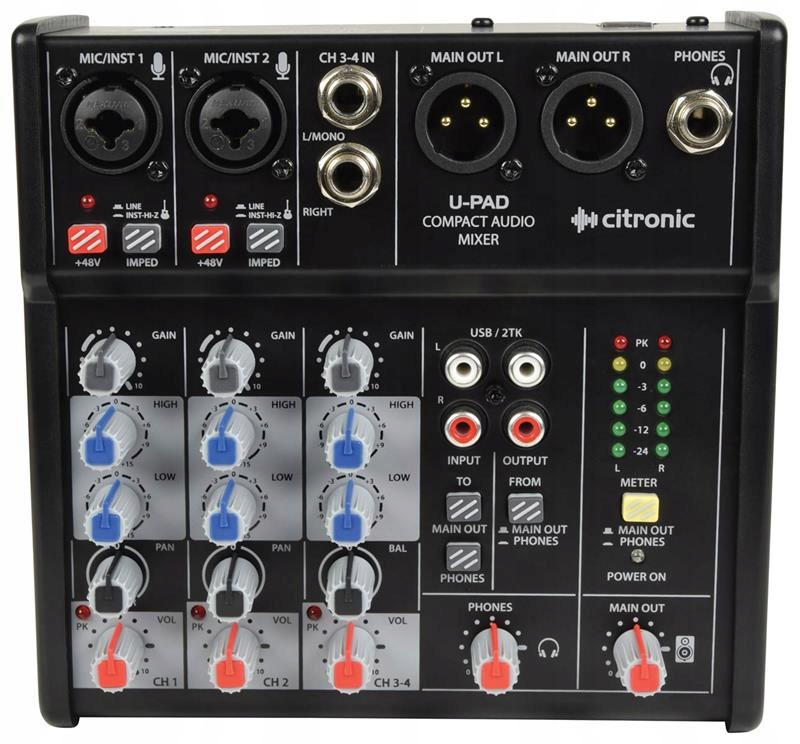 Регулювання високих/низьких/низьких панорам доступний на всіх моно та стерео вхідних каналах. Цифровий USB -вхід можна відправити безпосередньо до навушників для початкового прослуховування.