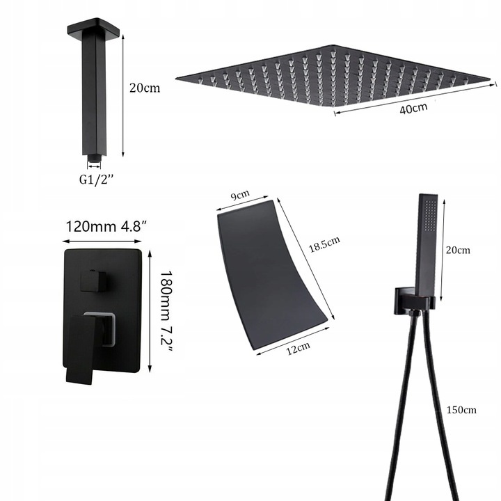Стильний і сучасний душовий набір чорного матового кольору - ВЕРСІЯ З ПІДСВІЧЕННЯМ 40 LED ДОЩОВИК ТА ДОДАТКОВИЙ ВИЛИВ ТИПУ ВОДОСПАД!