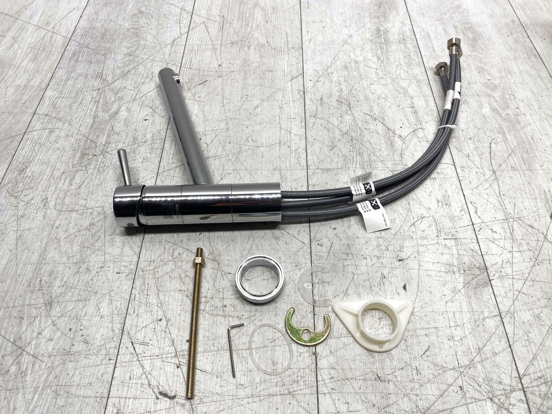 Змішувач також характеризується гнучкою металевою конструкцією з’єднувального шланга, виливом, що повертається на 150°, металевою ручкою, керамічними дисками та тихим, змінним картриджем 40 мм.