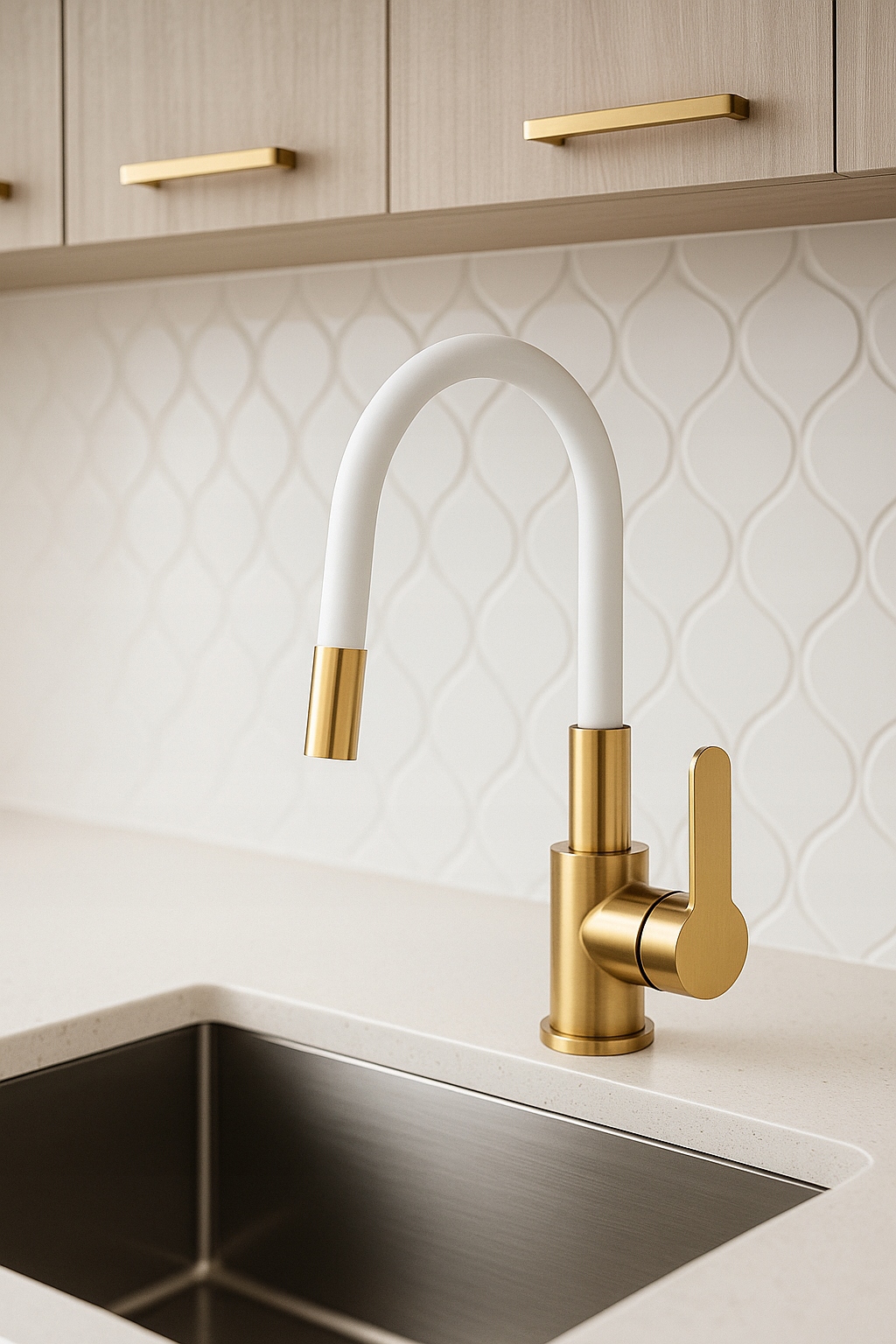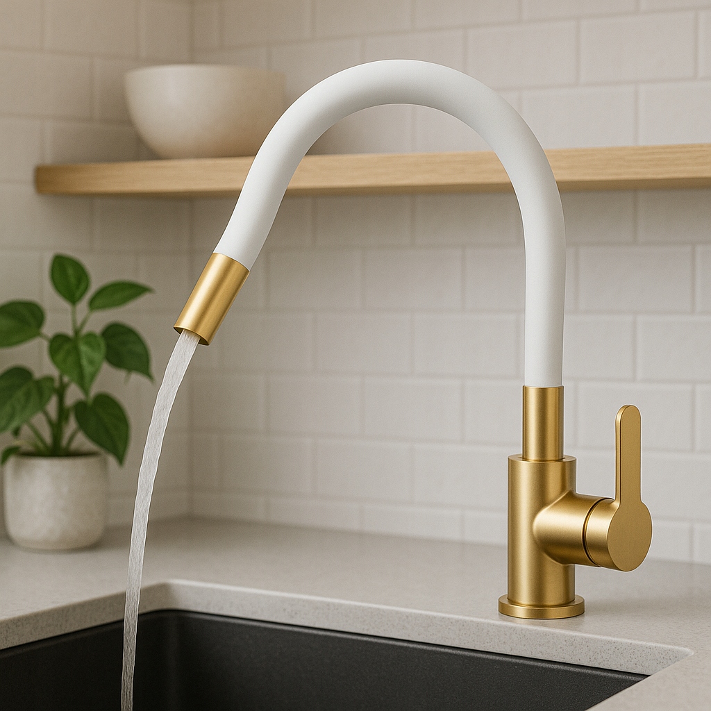 БІЛИЙ КУХОННИЙ ЗМІШУВАЧ, МАШИРОВАНЕ ЗОЛОТО, ГНУЧКИЙ ВИЛИВ, КУХОННИЙ КРАН