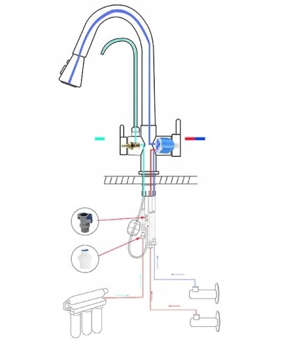 Трьохходовий кран оснащений двома незалежними контурами. Перший відповідає за подачу гарячої і холодної води. Другий дозволяє підключатися до фільтрованої води. Завдяки доступу з двох незалежних каналів триходовий змішувач позбавляє від необхідності використовувати додатковий кран на водяному фільтрі.