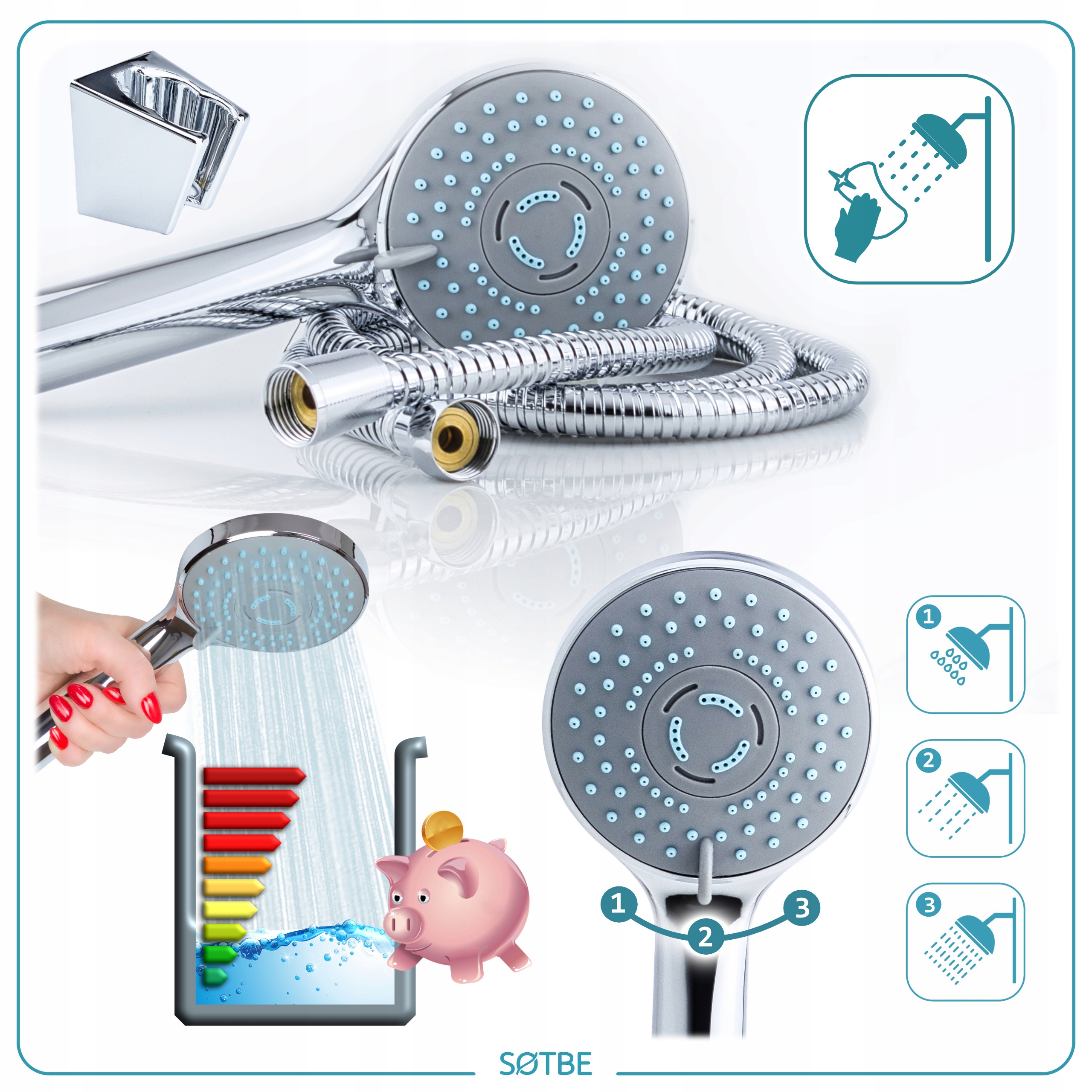 - 3-функціональна душова лійкадіаметром 12 см з функціями гідромасажу, дощового потоку та змішаного потоку. Велика, легка душова лійка виготовлена з пластику, при падінні вона не зруйнує ванну, як це було з важкими металевими душовими лійками