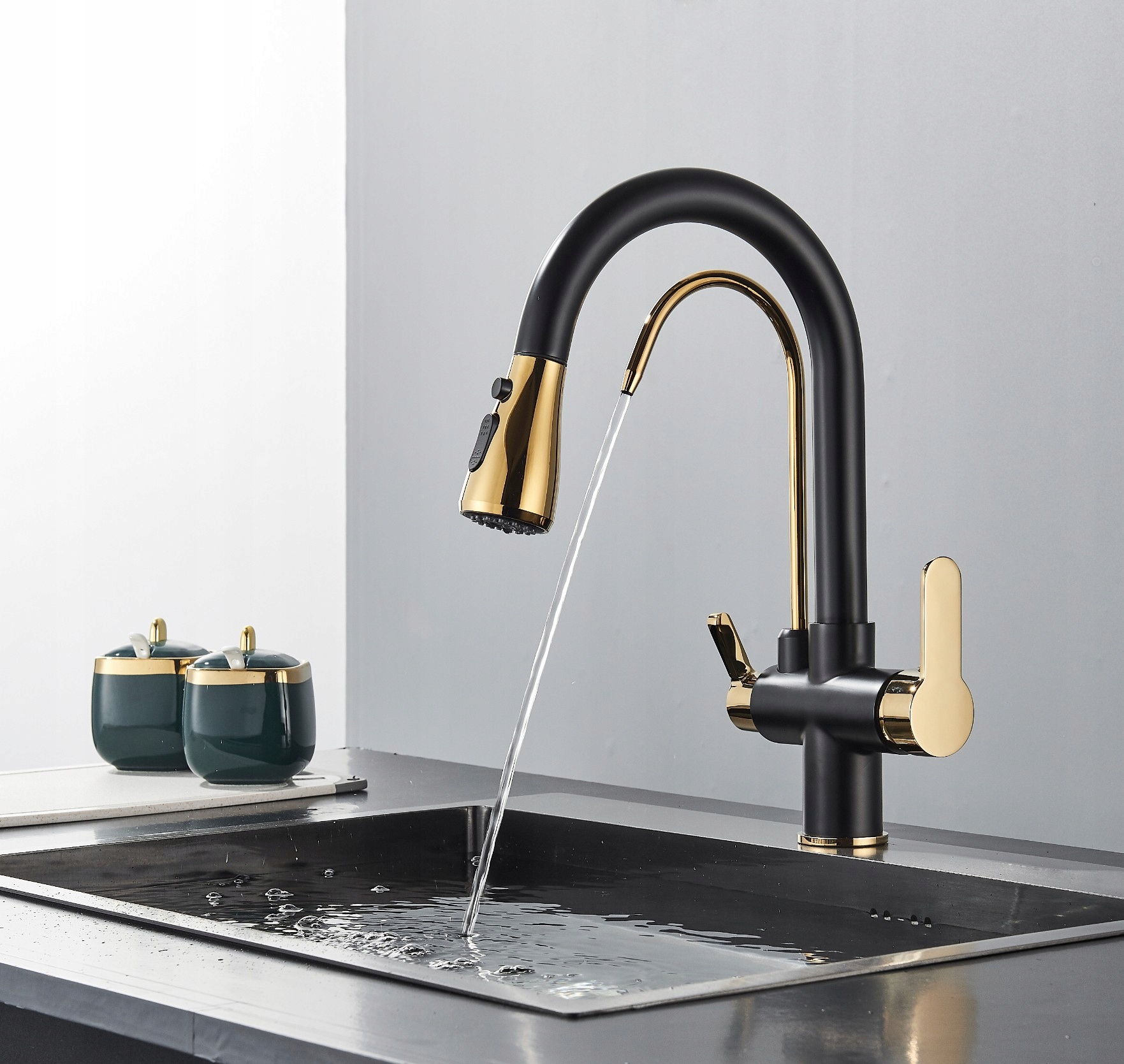 Змішувач КУХОННИЙ ТРИХОДОВИЙ з висувним виливом і краном для кухні ARI BRASS