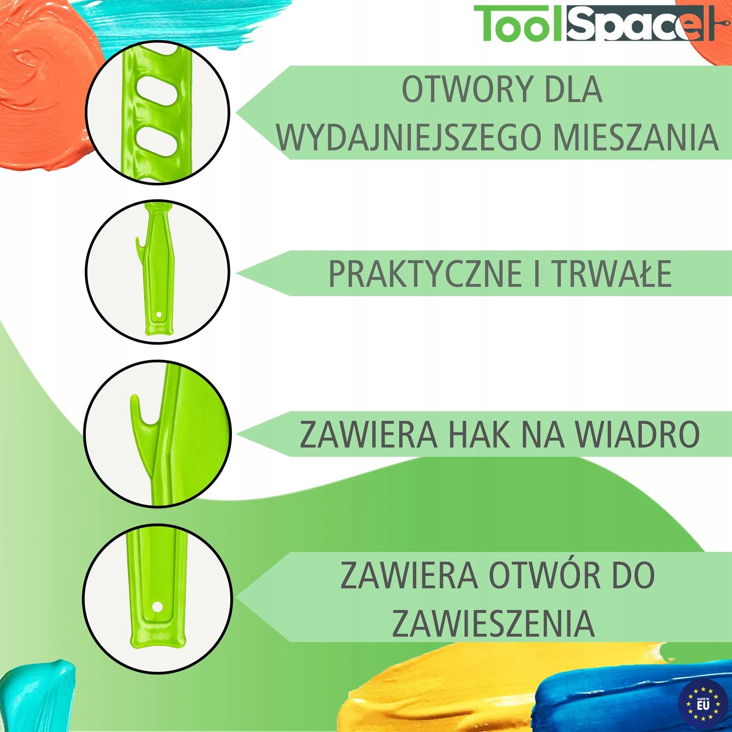 Мішалку ToolSpaceлегко очистити після використання. Їх можна мити водою або очищати від залишків фарби ганчіркою. На відміну від металевих змішувачів, вони не схильні до іржавіння, що полегшує їх утримання в чистоті. Використання дерев’яних мішалок може призвести до розколу.
