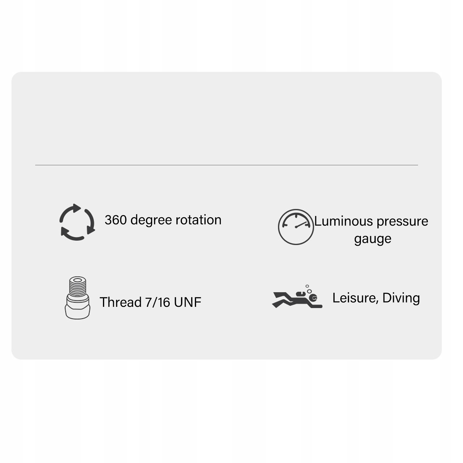 3. Інтерфейс 7/16-20UNF: Шланг регулятора високого дайвінгу має нитку 7/16-20UNF і може бути підключений до будь-якого інтерфейсу дайвінгу з високим тиском.