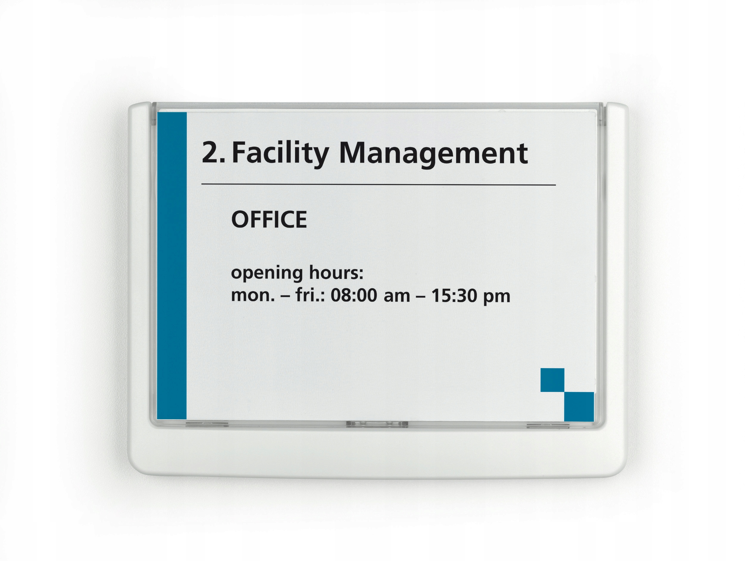 - Професійна інформаційна табличка на або біля дверей з естетичним і прозорим дизайном.