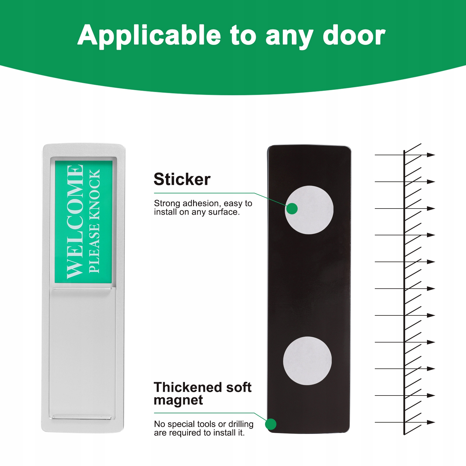 Ви можете легко встановити цю дверну табличку за допомогою 2 аркушів двосторонньої клейкої стрічки або магнітів, не потребуючи спеціальних інструментів чи свердління.
