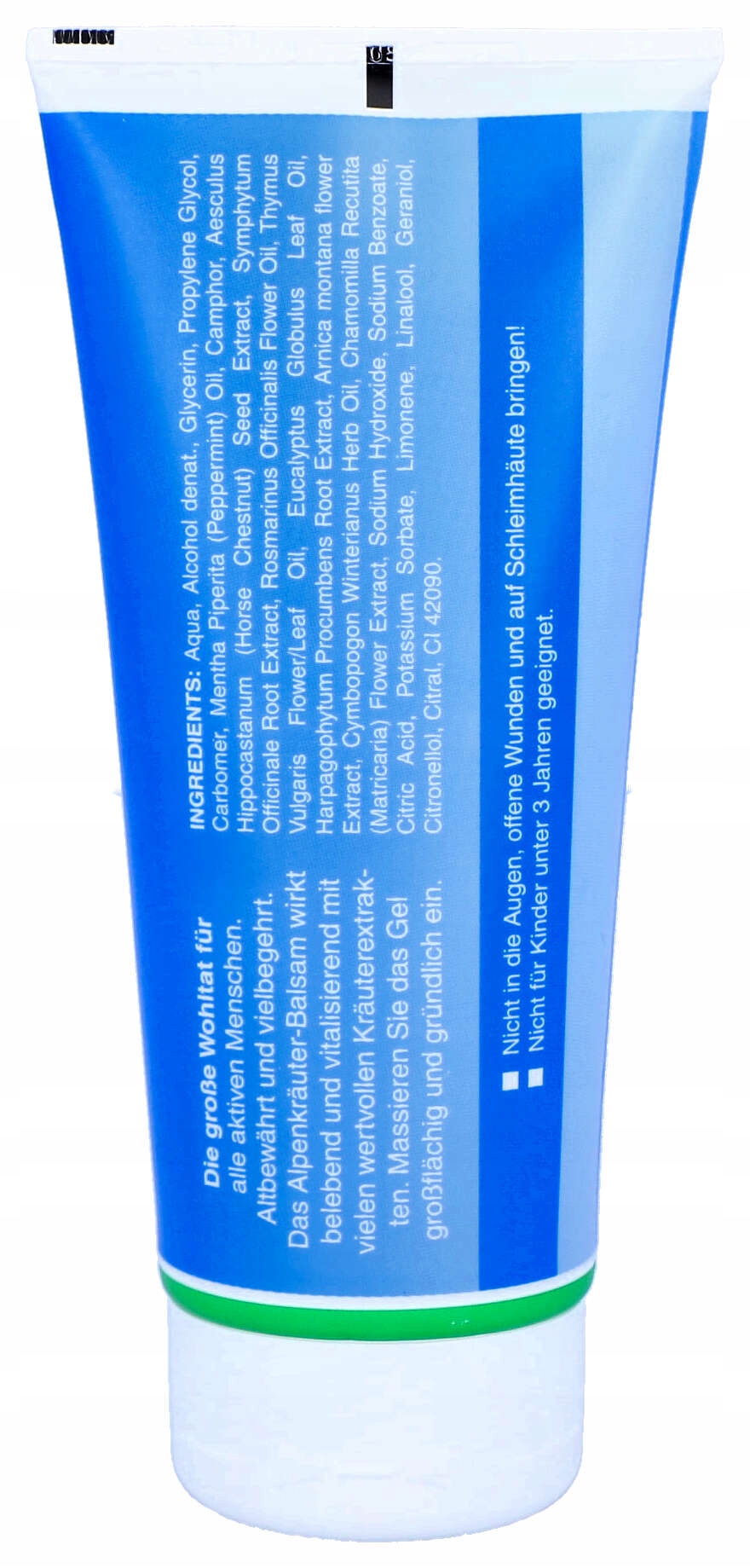 Аква, денатований спирт, гліцерин, пропіленгліколь, карбомер, олія м’яти перцевої, камфора, екстракт насіння кінського каштана, екстракт кореня живокосту, олія квітів розмарину лікарського, олія квіток/листя чебрецю, олія листя евкаліпта, гарпагофітуму лежачого екстракт кореня, екстракт арніки гірської, олія трави Cymbopogon winterianus, екстракт квітів ромашки, гідроксид натрію, бензоат натрію, лимонна кислота, сорбат калію, лімонен, ліналоол, гераніол, цитронелол, цитраль, CI 42090