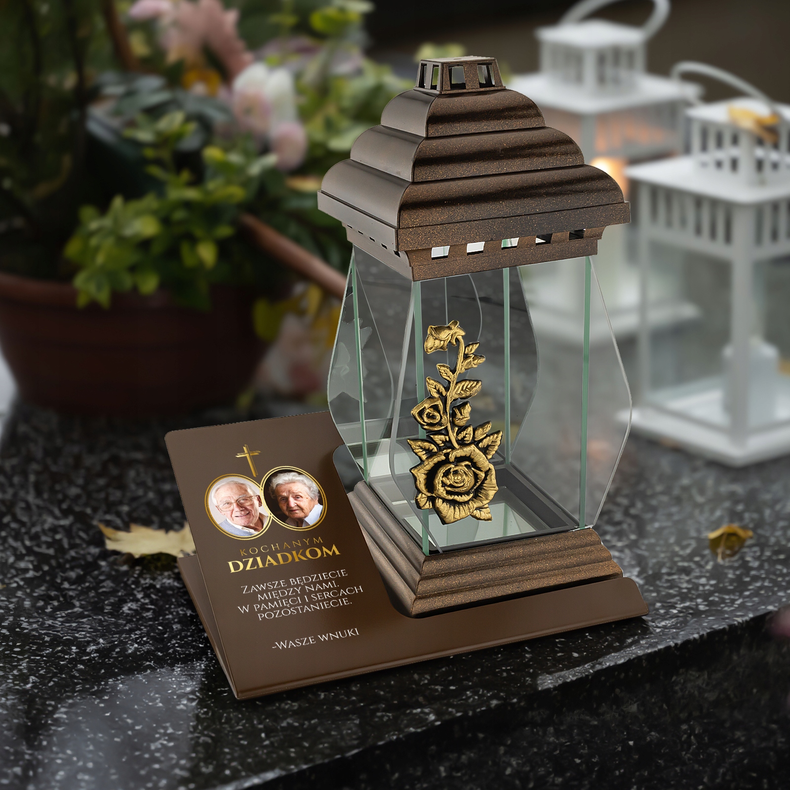 ZNICZ z PERSONALIZOWANĄ METALOWĄ PODSTAWKĄ na GRÓB DLA DZIADKÓW + DEDYKACJA