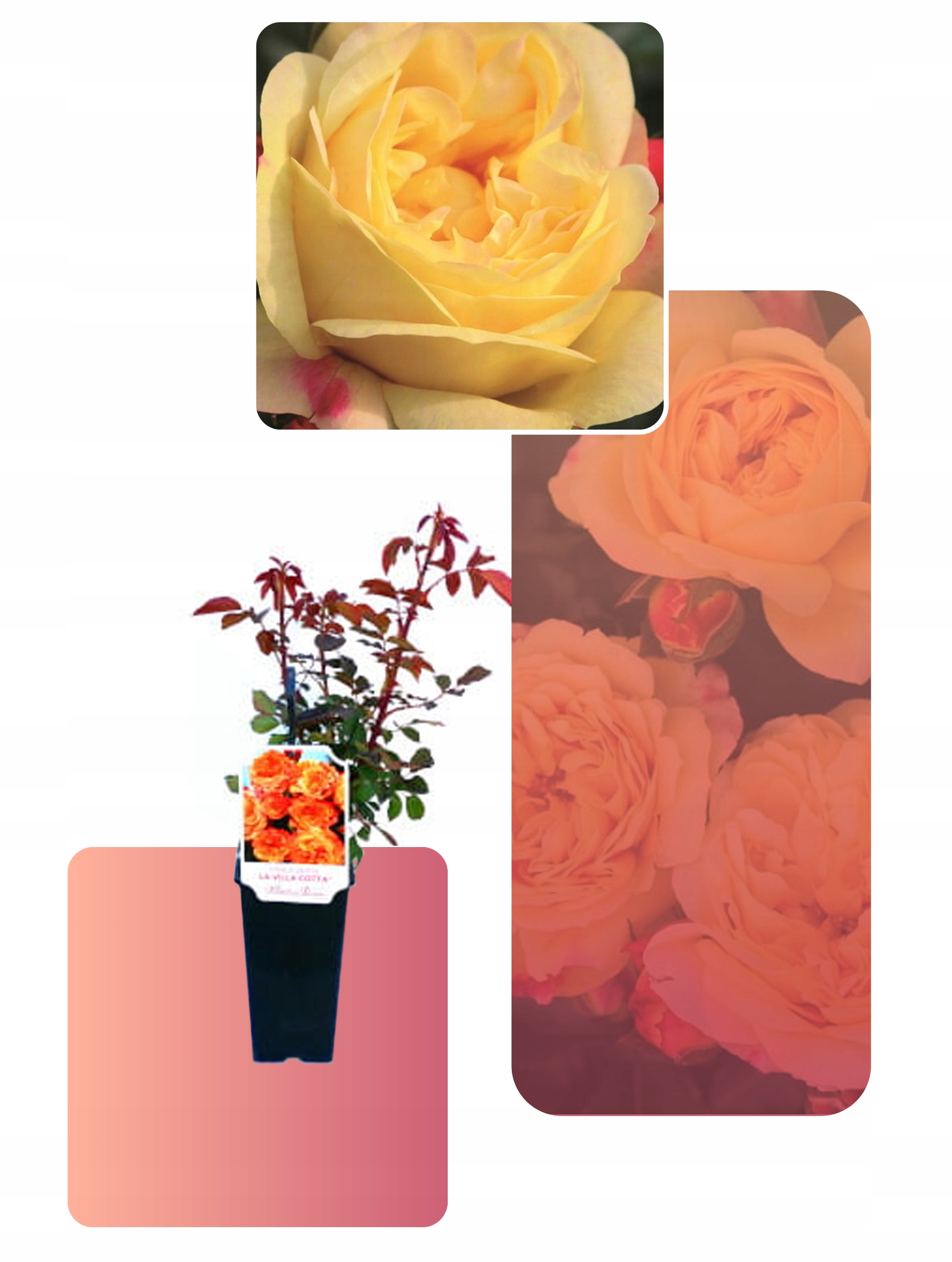 великі квіти , дуже гарно форма, спочатку сферичні, потім розетин з теплим чисто жовтим тоном з легким крапом малини. Коли він процвітав, вони виглядають як рожевий .
