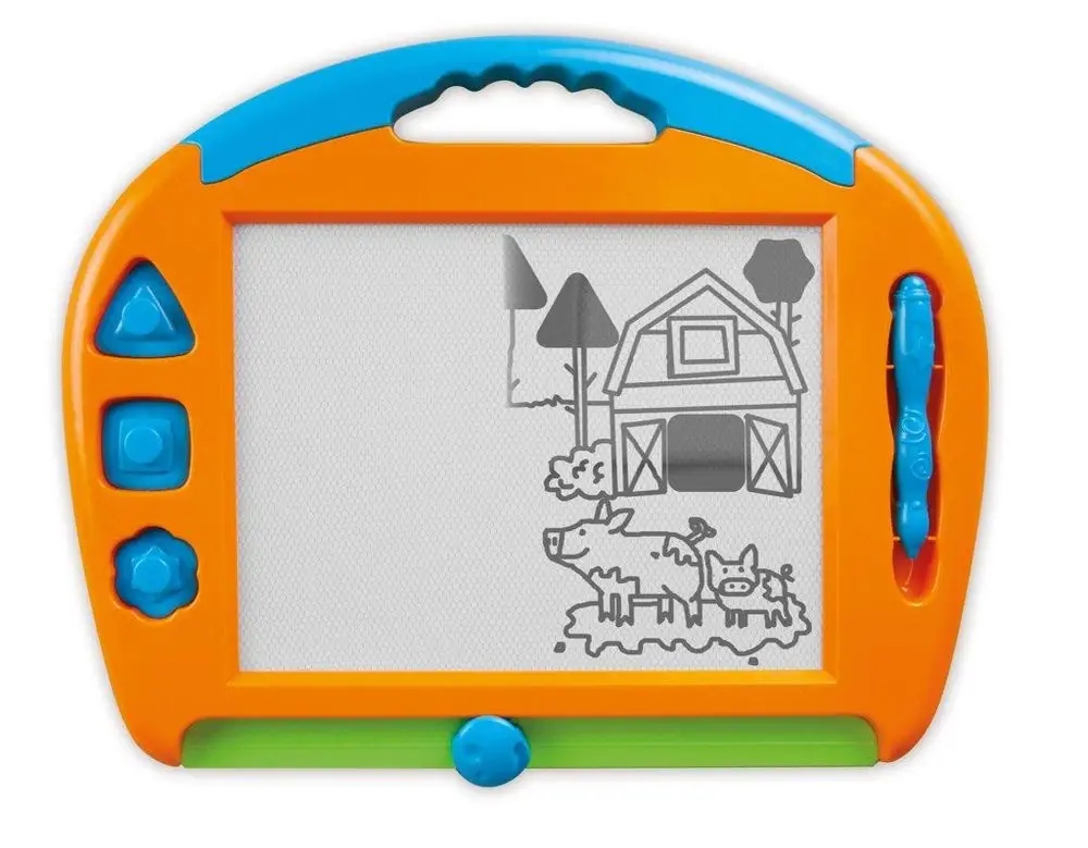 Магнітне зникнення рожевим із зеленими та синіми елементами, ширина 41 див. Цей продукт є інноваційним, оскільки отримана картина барвиста. Крім того, набір включає 3 марки різних форм. Щоб усунути малюнок, вам потрібно лише перемістити повзунок, розташований нижче дошки, по всій його довжині. Іграшка має зручну ручку, що переносить та спеціальну ручку для креслення.