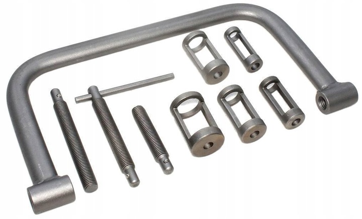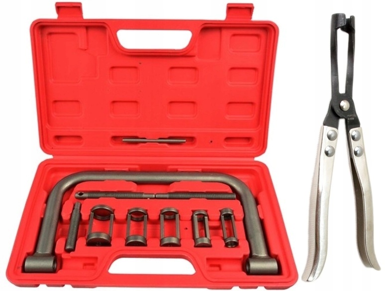 Опис інструменту:Інструмент зі змінними адаптерами для стискання пружин клапанів. У комплект входить п'ять перехідників різного діаметру. Плоскогубці для демонтажу сальників клапанів.