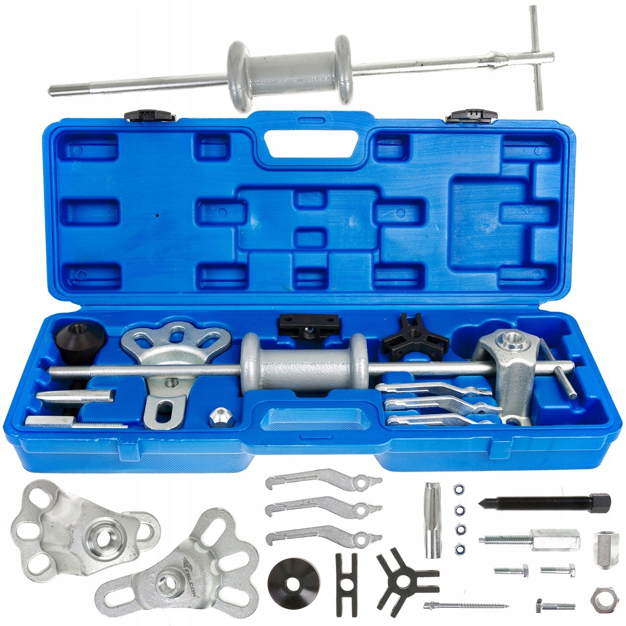Професійний інерційний кузовний молоток. Він великий і універсальний. Призначений для ремонту кузова, всіх робіт з листового металу, демонтажу обойм підшипників та інших щільно підігнаних деталей у важкодоступних місцях. У набір входять різні типи захватів, киянок, редукторів тощо. Дуже корисні в кожній майстерні. Різьба з добре різьбленням, загартована сталь.