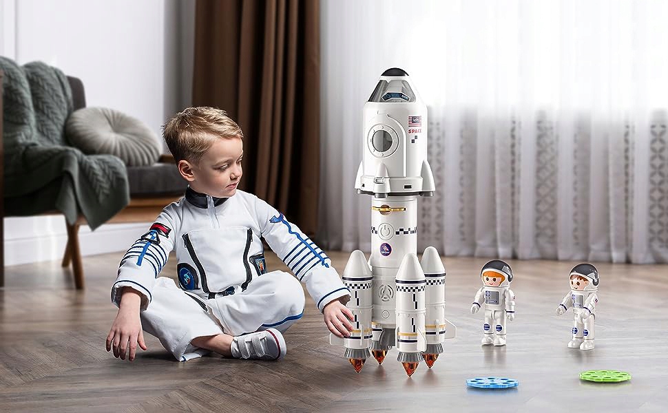 - ☑️Знімна ракета 5-в-1:Ракета складається з двох астронавтів, космічного корабля, ракети першого ступеня, ракети другого ступеня та 4 прискорювачів. Знімний ігровий набір «Астронавт» також портативний, і діти можуть грати в космічні пригоди! Кожна капсула може бути окремою або інтегрованою ракетою. Крім того, діти можуть цікаво дізнатися про будову ракет.