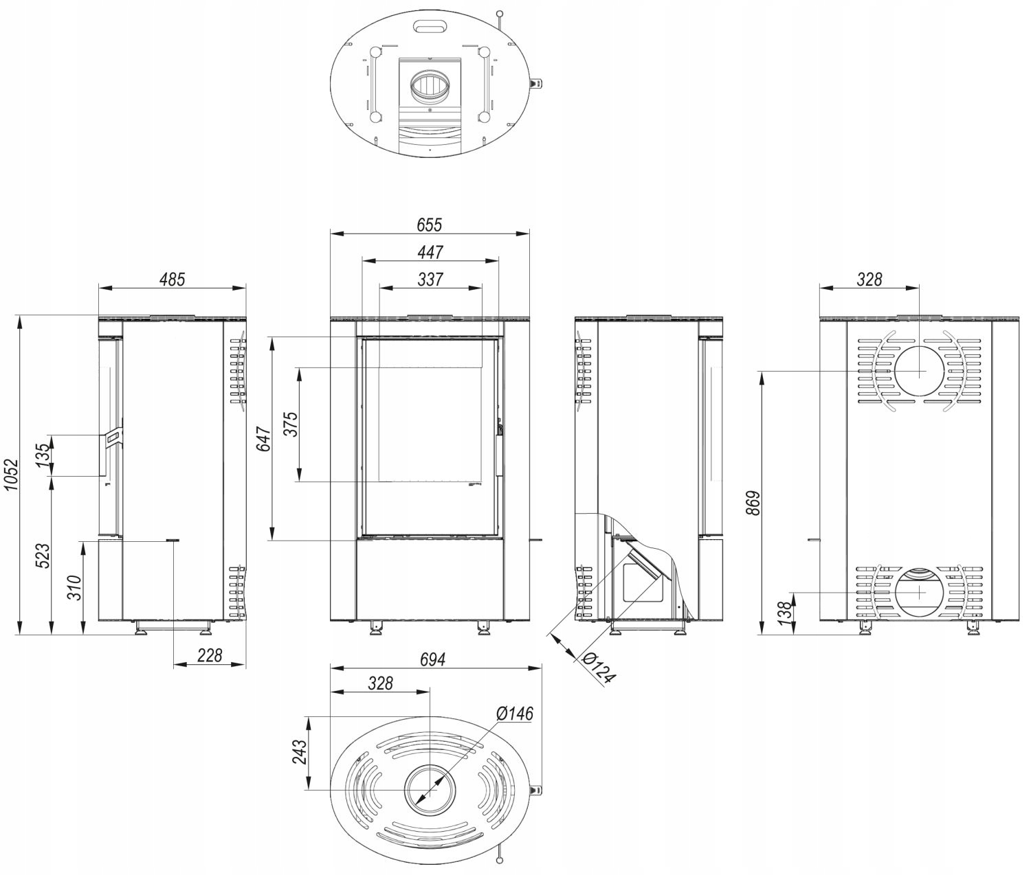 4 камери згоряння з спеціальним типом кераміки, що ефективно впливає на процес згоряння та накопичення тепла, мульти -потік - оригінальне рішення, що постачає повітря для згоряння, що забезпечує відмінний контроль над пожежею Верхній або задній випускний вихід Адаптоване до відродження відповідає вимогам eco -poperation