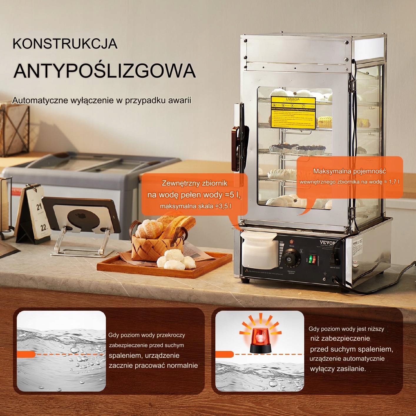 Світлодіодне освітлення підкреслює зовнішній вигляд посуду, що зберігається, привертаючи увагу клієнтів. Нахилені полиці запобігають осіданню води на продуктах. Пристрій поєднує в собі функції зберігання, розігріву та подачі їжі.