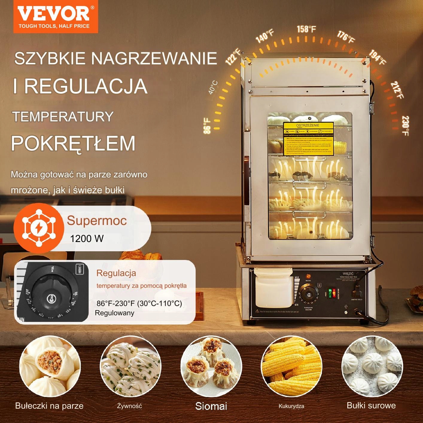Професійна грілка має п'ять полиць, на які можна помістити 50-60 булочок, приготовлених на пару. Це ідеальне рішення для зберігання та презентації великої кількості продукції. Це добре працює в ресторанах із великою відвідуваністю.